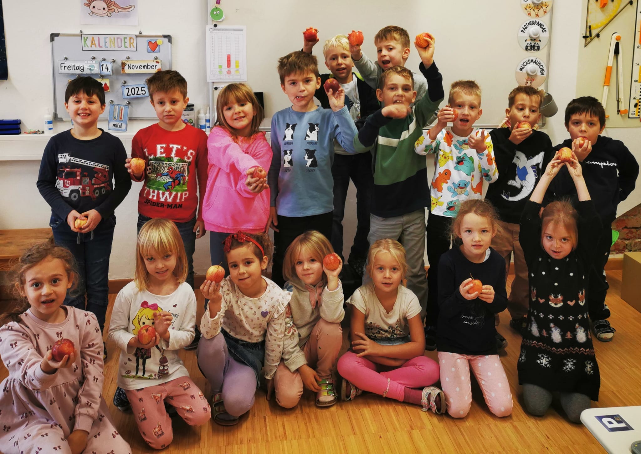 In den vergangenen beiden Wochen haben wir uns in der Schule intensiv mit dem Thema Apfel beschäftigt. Nachdem wir gemeinsam besprochen hatten, wie ein Apfel aufgebaut ist und warum er so gesund für uns ist, durften die Kinder an einer kleinen Genussschulung teilnehmen. Drei verschiedene Apfelsorten wurden dabei genau unter die Lupe genommen. Wir betrachteten sie aufmerksam, rochen an ihnen, kosteten sie schließlich und bewerteten jede Sorte. Am Ende stand fest: Die Apfelsorte Pink Lady gewann mit den meisten Punkten und wurde zu unserem Siegerapfel gekürt.