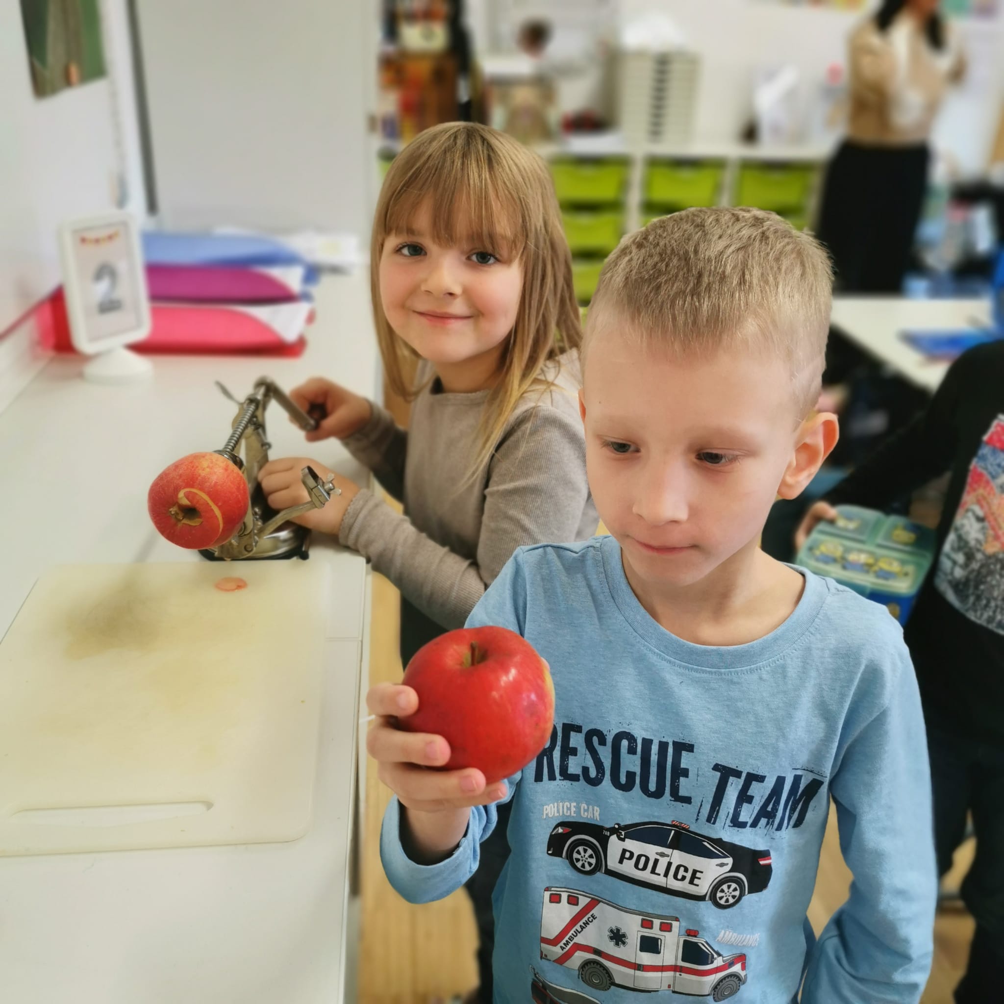 In der Jausenpause hatten die Kinder anschließend die Möglichkeit, ihren Apfel in Spiralen zu schneiden, eine Aufgabe, die ihnen sichtlich große Freude bereitete. Auch das Lied „In meinem kleinen Apfel…“ sangen wir gemeinsam mit viel Begeisterung.