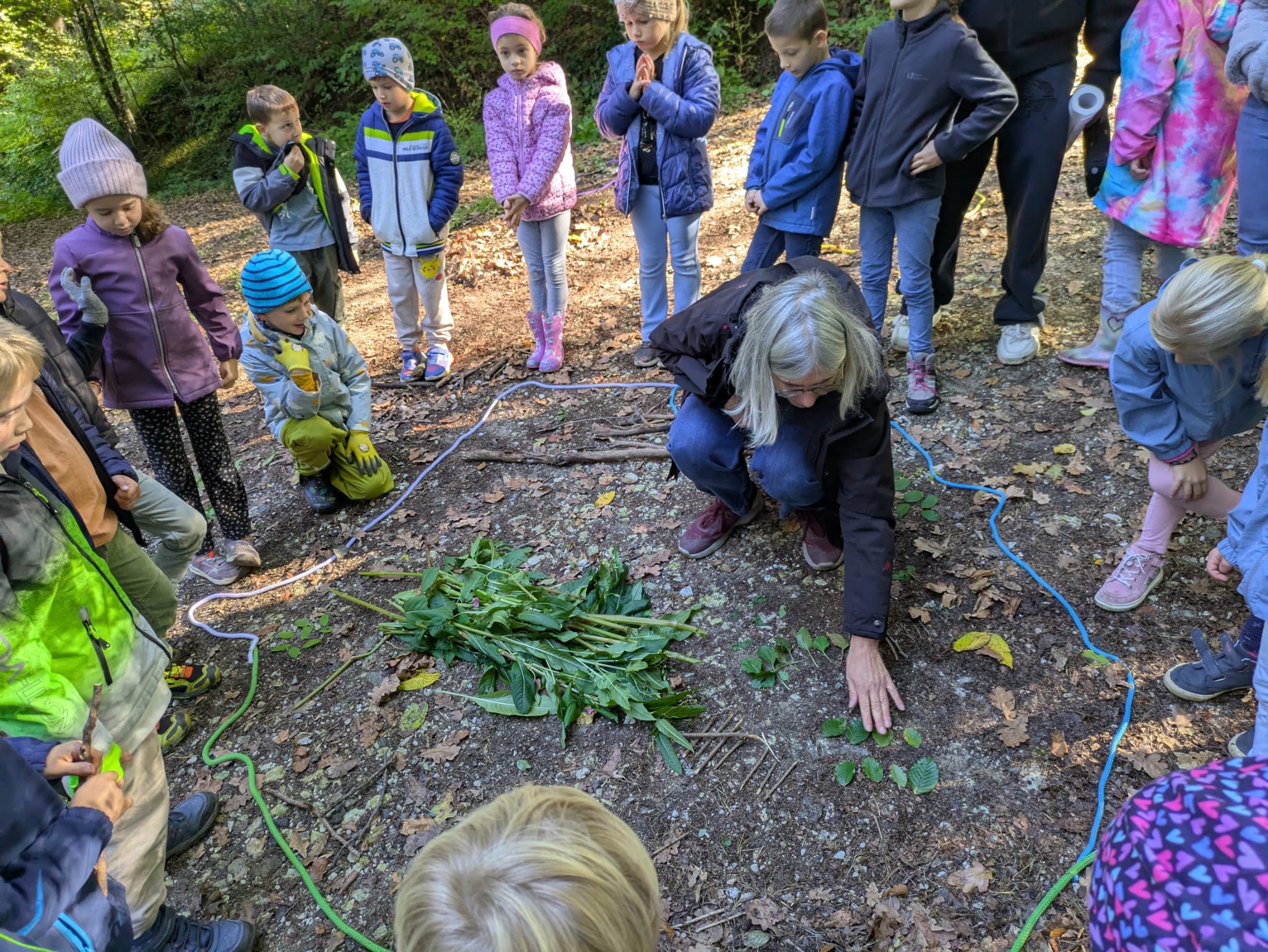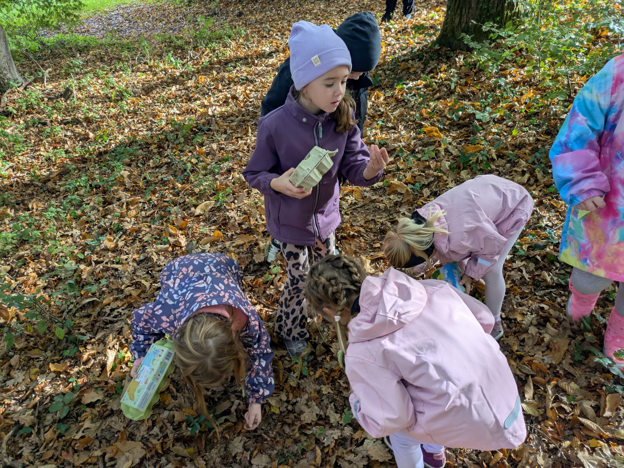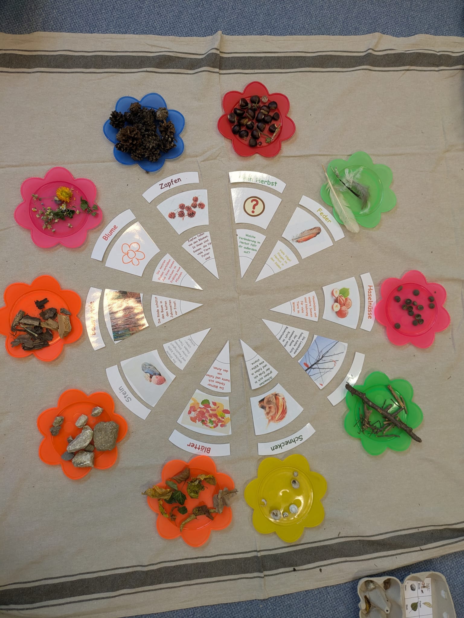 Bei so schönem Herbstwetter wird auch die eine oder andere Mathematikstunde ins Freie verlegt – dort werden mit Naturmaterialien Ziffern und Mengen gelegt.