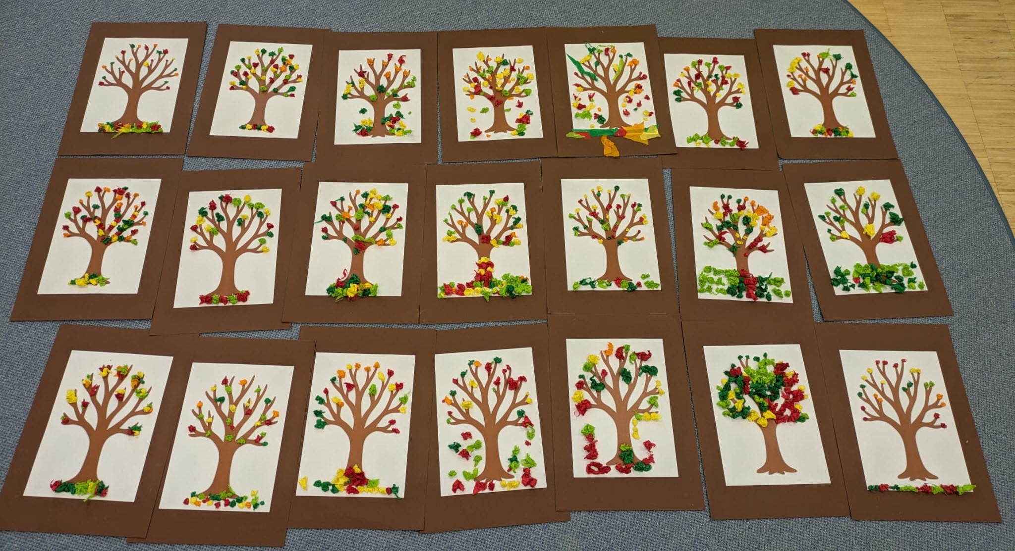 Die Kinder der Blauwalklasse hingegen sammeln viele bunte Blätter im Wald und basteln daraus lustige Blätterwichtel mit fröhlichen Gesichtern.