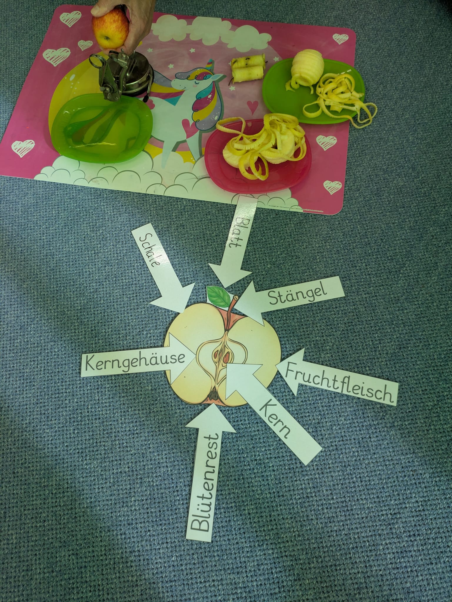 In dieser Woche dreht sich bei uns alles rund um den Apfel! Die Kinder lernen die verschiedenen Teile des Apfels kennen. Gemeinsam wird untersucht, betrachtet und dabei gelernt. Als Highlight dürfen die Kinder mit einem Apfelspiralschneider selbst sogenannte „Apfelspaghetti” herstellen. So lecker kann Lernen sein – gesund, spannend und mit allen Sinnen begreifbar!