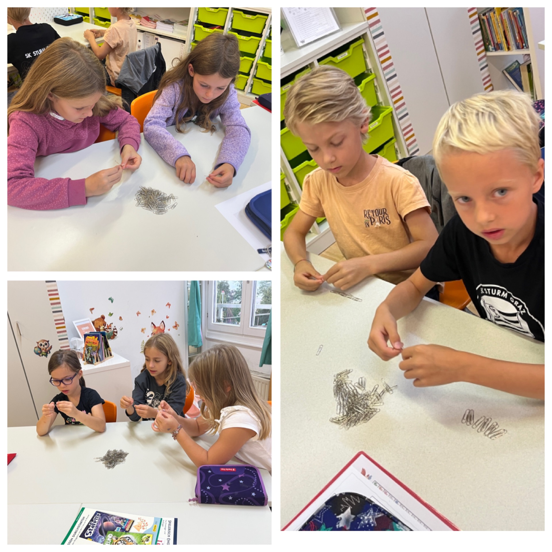 Mit viel Geduld und Teamarbeit hängten wir unsere lange Büroklammer-Kette stolz im Klassenzimmer auf.